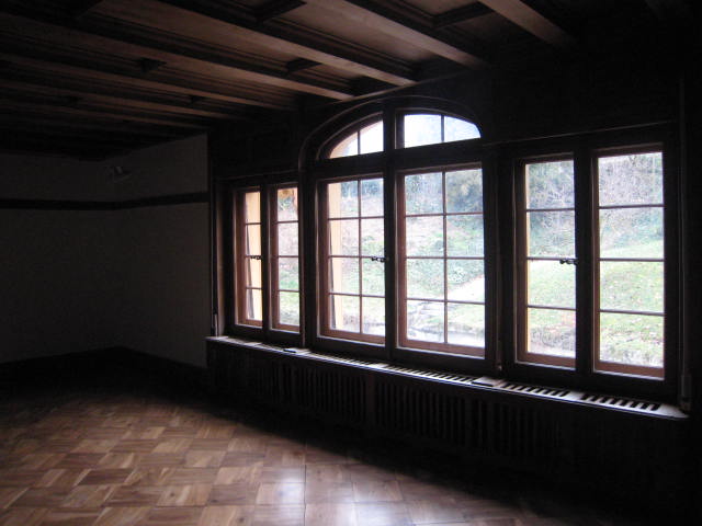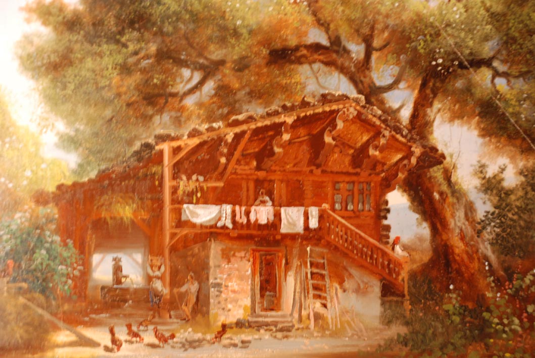 3. La Galerie des quatre peintres et des quatre saisonsEn 1866, dès son retour de San Francisco au Moulin, Alfred Borel embellit sa demeure. En 1867, il fait appel à un peintre italien, Antonio Valentino, qui a un atelier à Berne, pour décorer la fameuse « Galerie bernoise » de son oncle Antoine, et en faire la Galerie aux quatre peintres et aux quatre saisons. Antonio Valentino a fait ses études à Pompéi et laisse entrevoir cette origine dans les parties décoratives: fonds ocres, faux marbres, trompe-l’œil du plafond. En 1875, une partie du plafond de la salle s’écroule. Alfred Borel recourt de nouveau à Valentino pour le refaire, et avec l’aide d’un peintre paysagiste bâlois, Arnold Jenny, il réalise une frise courant tout autour de la pièce. C’est la partie la plus achevée du salon qui évoque des paysages des quatre saisons. Les qualités de Jenny transparaissent en tableaux exquis: scènes champêtres dans des décors italiens ou alpins, avec un clin d’œil obligé au Pays de Neuchâtel. Alfred Borel fait encore appel à un ami d’enfance, le peintre Auguste Bachelin pour réaliser quatre portraits en médaillons de quatre générations de Dames Borel. Il y a correspondance de saison entre les panneaux de Jenny et chacune des têtes de Bachelin qu’ils encadrent: L’Eté, Marie Helbing, femme d’Alfred;